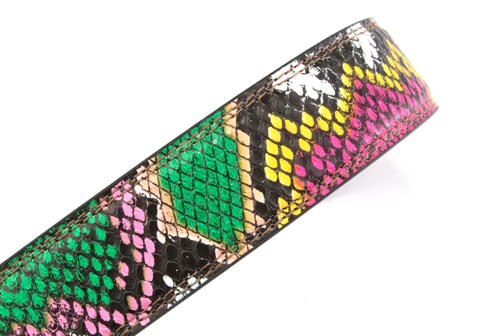 This Multi-Colored Boa print strap is made with an animal friendly PU faux leather material that features a boa scale pattern with great texture. The color pattern of this particular multi-colored boa is pink and dark green dominate.