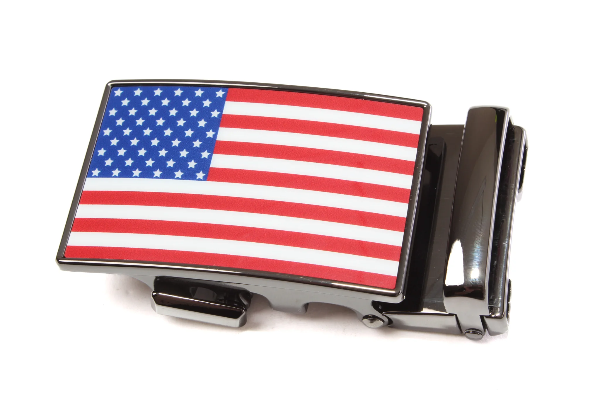 The 1.5" USA Flag - Full Color- in Smoked Gunmetal buckle is the perfect way to display your patriotism with class. The full-color Flag really pops when in the Smoked Gunmetal frame finish.  As with all of our buckles, it uses Micradjust TechnologyŸ for the perfect fit.
