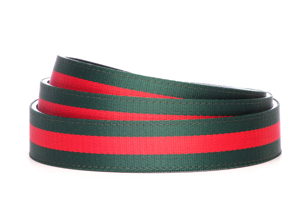 3.) Red and Green Striped Cloth. This red and green striped cloth strap is made with a smooth cloth cotton blend front with a micro-fiber backing for added durability. With the bright red stripe, this strap is perfect for adding a splash of color to any outfit.
