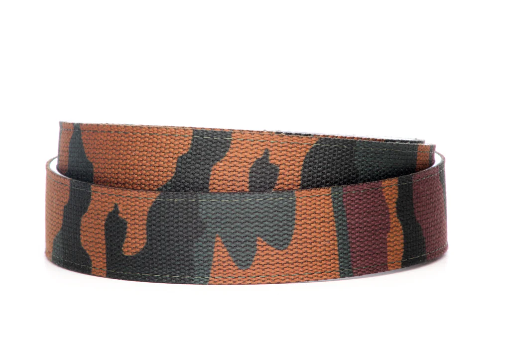 1.) Camo Canvas. Our Camo canvas strap features a cotton blend camo patterned front, with a micro-fiber backing. It also features a "spine" in the middle, for added rigidity.